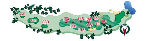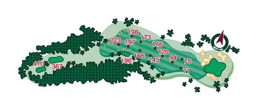 The uphill tee shot can be difficult and big hitters can drive the ball through the fairway. A slice makes for a long second shot to a tough green. Still a good tee shot puts a wedge in the player’s hand for the approach and a chance at a good score. Pick the club off the tee that gets you to your best distance and hope to find the flat part of the fairway.