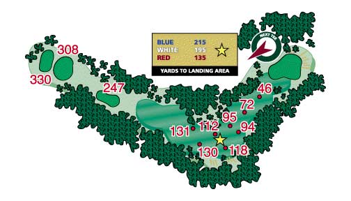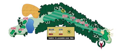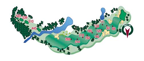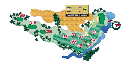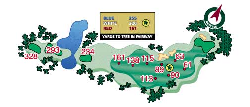 The downhill dogleg left is a nice golf hole. Your drive is what is important here as risk/reward comes in to play again. Big hitters can go too far and find the water. The trees on the left can hamper those trying to find the green from the tee box. With water behind and a sand trap in front of the narrow putting surface, a well-placed tee shot to favorite approach club is the ticket to a good score.