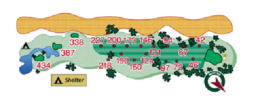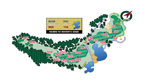 Water comes in to play on the tee shot of this fairly short par four. Playing to your favorite approach club should give you a chance at birdie. Enjoy the view and keep it in the fairway. The shape of the green makes for some interesting pin placements.
